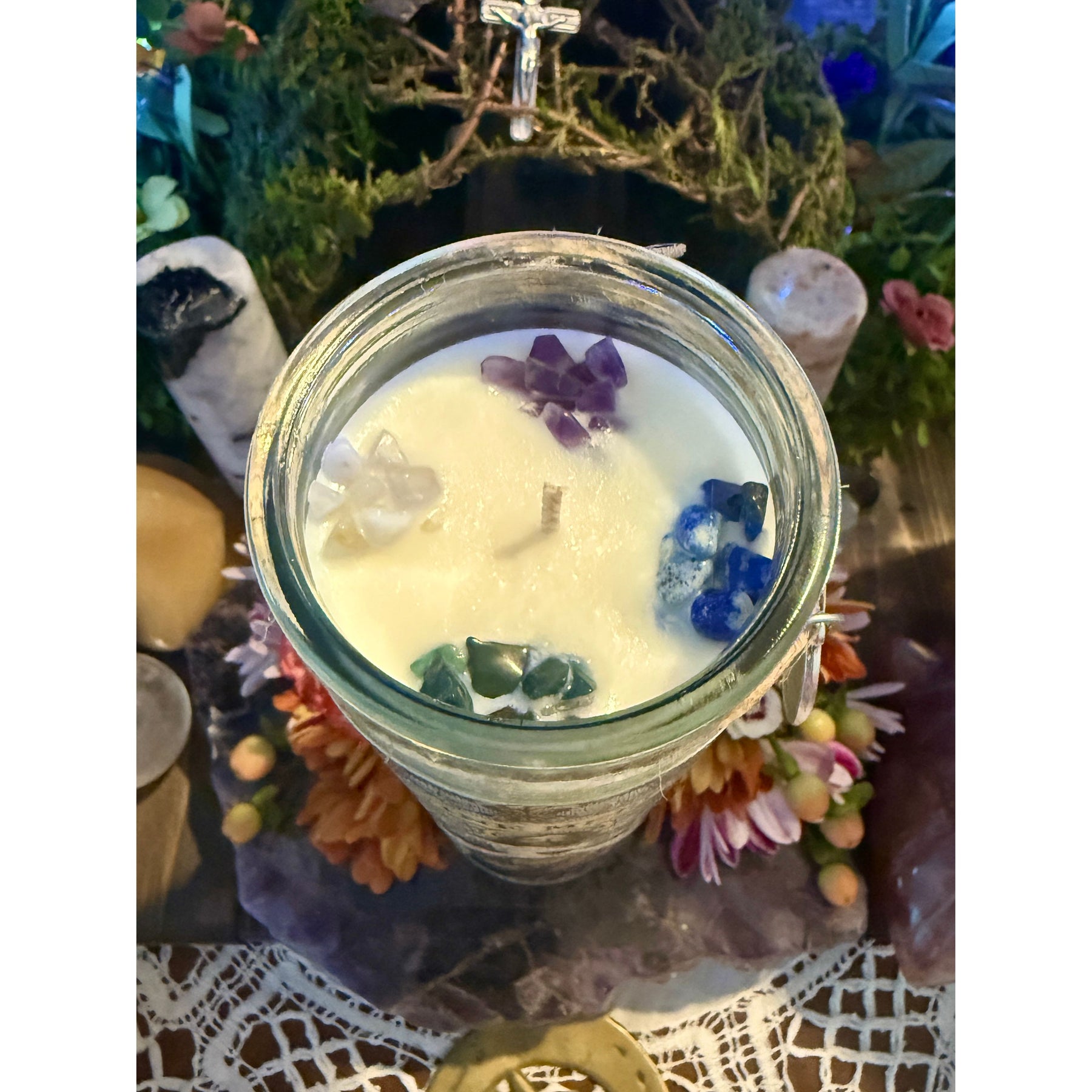 Within this jar, you’ll also find Amethyst, bringing balance, peace, and a connection to the spirit world; Black Onyx, to alleviate anxiety and enhance stability, strength, and power; Opal, symbolizing hope and transformation; and Turquoise, for healing, beauty, and harmony. These treasures harmonize to elevate the spiritual vibration of this candle, guiding your sacred celebration to a higher plane.
