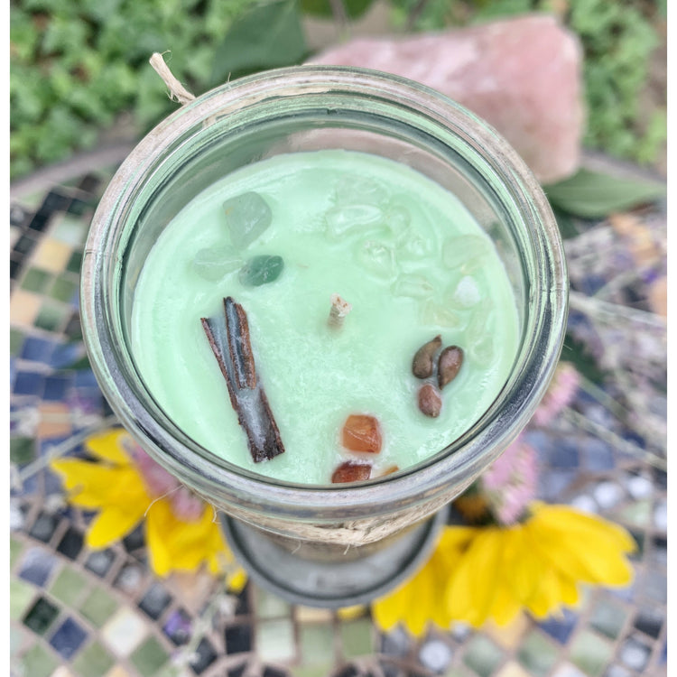 Mabon is a handcrafted 16 oz soy and beeswax, cotton-wicked, crystal blessed candle infused with a special blend of oils and crystals to enhance its spiritual vibration.