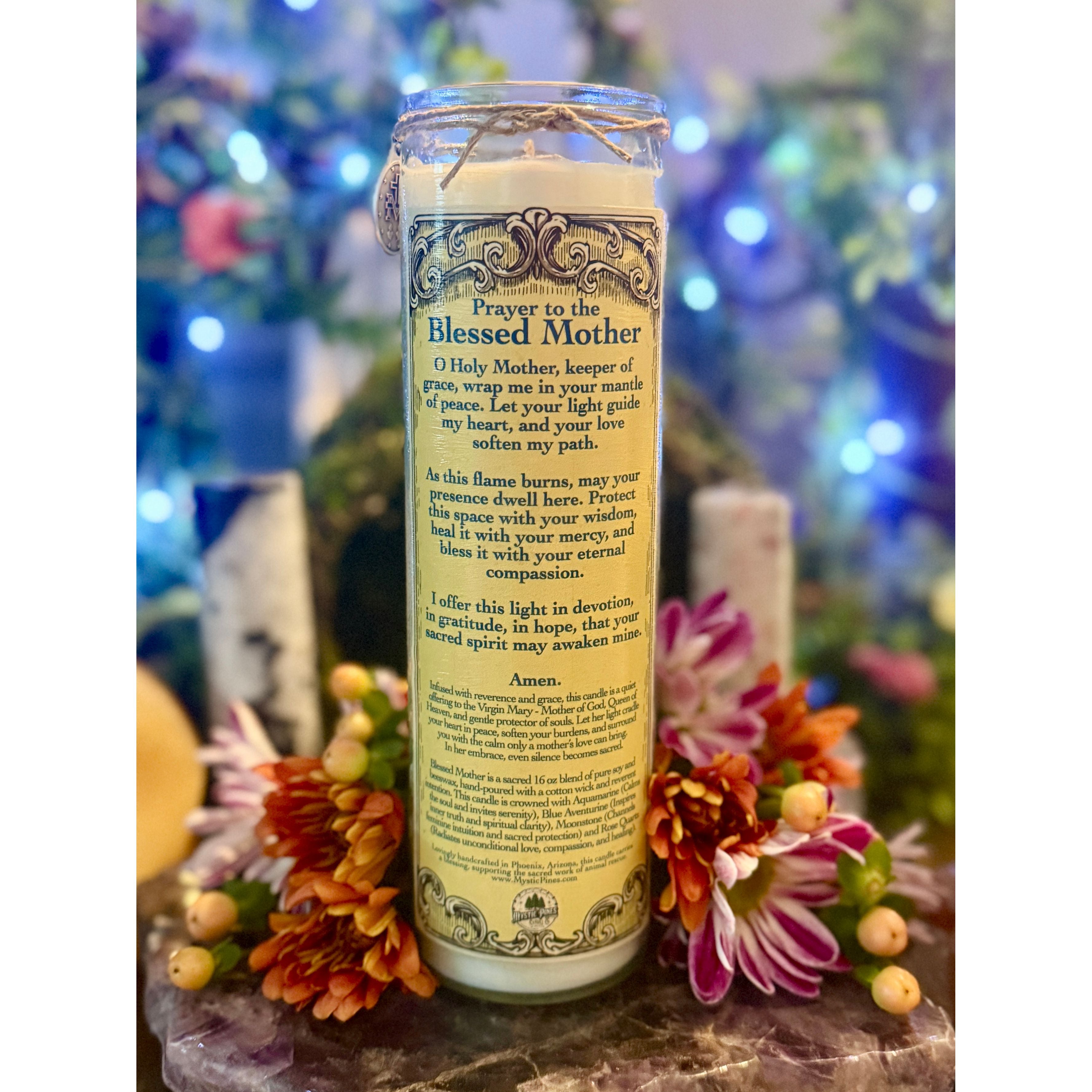 A gentle flame of maternal grace, our Blessed Mother candle is a tribute to the sacred feminine and the tender embrace of divine love. Crafted with reverence from a pure blend of 100% soy and beeswax, and centered with a natural cotton wick, this candle offers a clean, serene burn ~ perfect for moments of prayer, healing, and spiritual connection. Its light becomes a sanctuary, inviting the presence of the Blessed Mother to comfort, guide, and protect.
