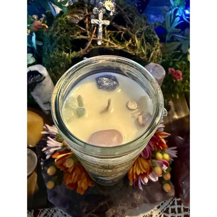 Adorned with a halo of four luminous stones, each candle carries a whisper of heaven’s touch of Aquamarine ~ A stone of tranquility and clarity, it soothes the soul and enhances spiritual communication. Blue Aventurine ~ Known for its calming and empowering energy, it encourages inner strength and heartfelt expression. Moonstone ~ A sacred gem of intuition and divine feminine energy, it nurtures emotional balance and spiritual insight and Rose Quartz ~ The stone of unconditional love, it opens the heart to compassion, forgiveness, and divine affection.