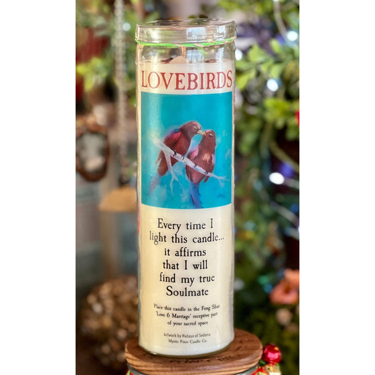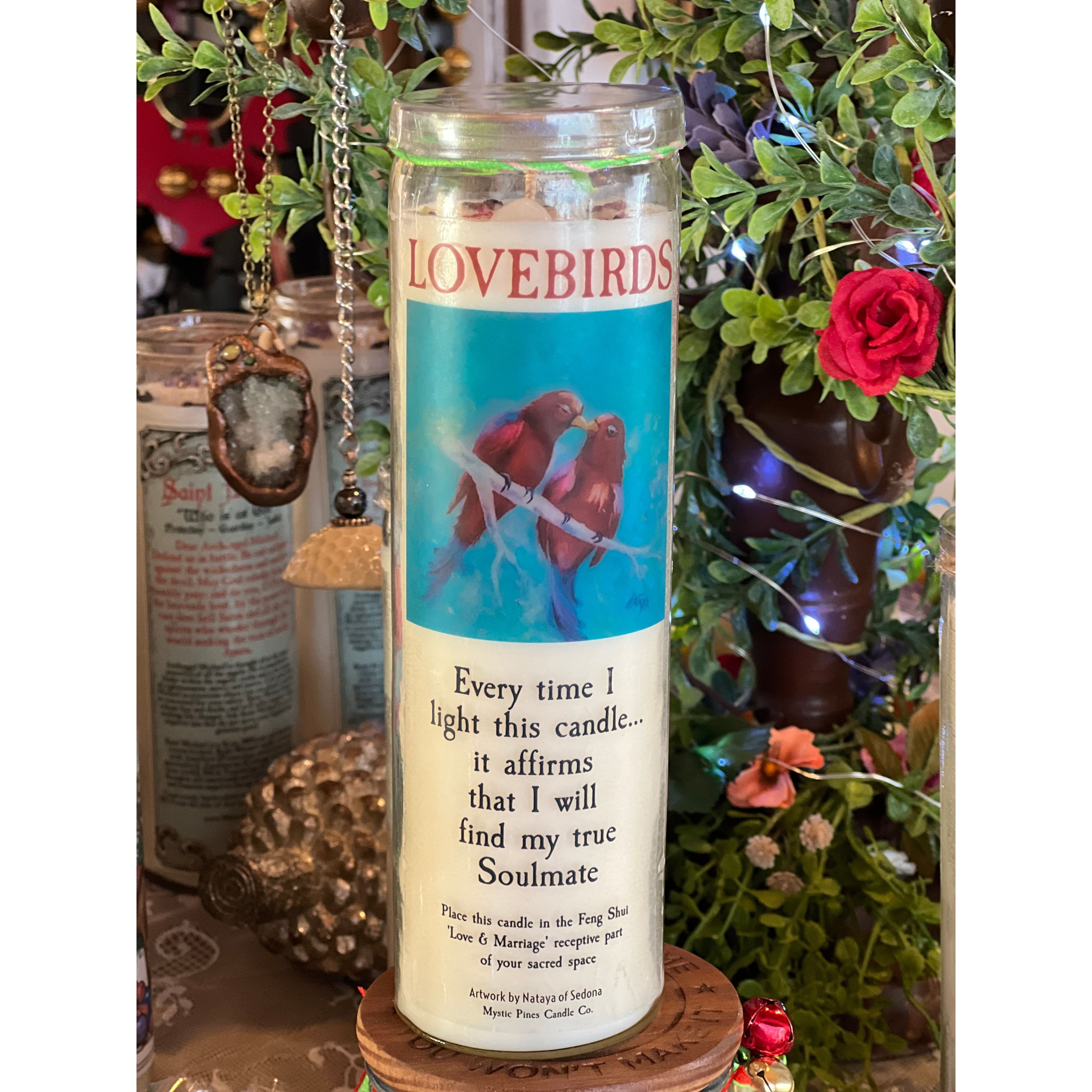 Our 100% American-grown soy and beeswax, cotton-wicked (lead-free), crystal blessed 'Lovebirds' candle was created for the Feng Shui 'Love & Marriage' receptive part of your sacred space. This candle is available in Rose, Tobacco Vanilla, Nag Champa or White Tea...and is crowned with Garnet, Peridot and Rose Quartz.