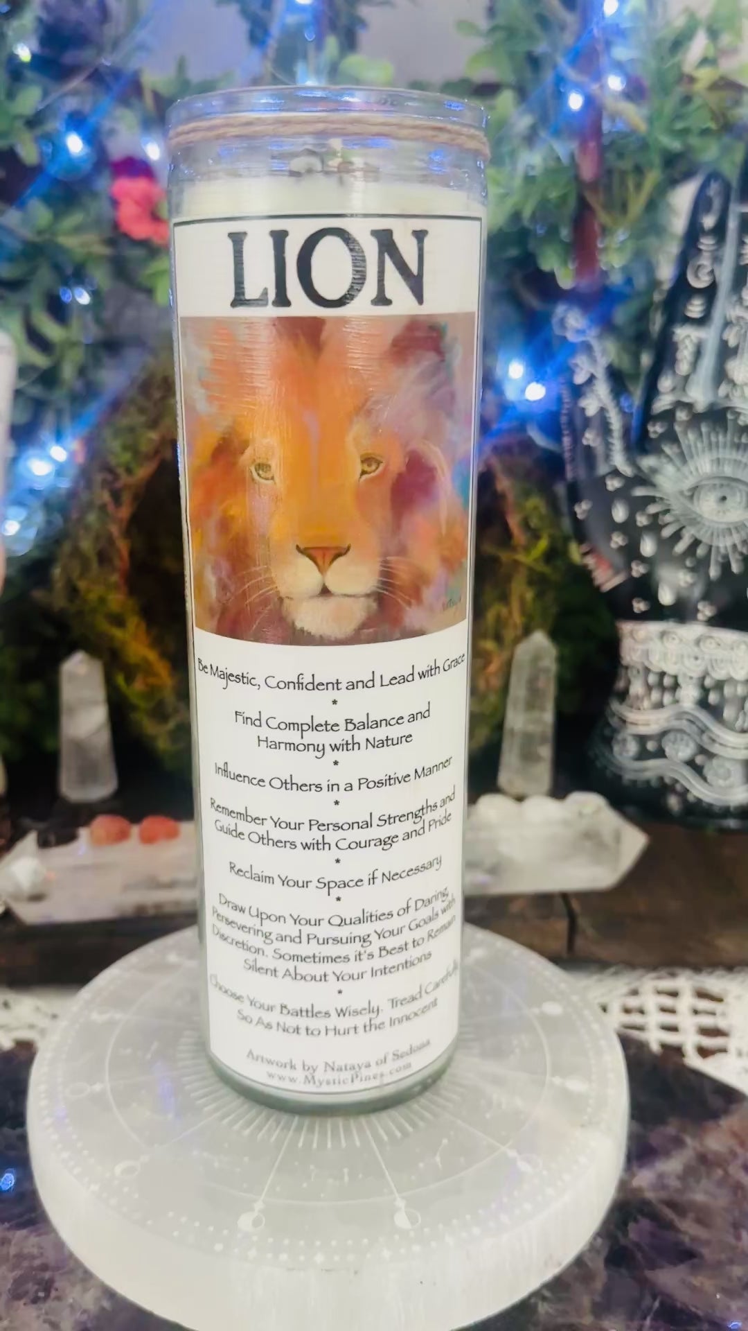 Our 16 oz, 100% soy wax, cotton-wicked Reiki Blessed Animal Totem candles can be lightly scented with Dragon’s Blood, Nag Champa, Tobacco & Vanilla or Unscented.