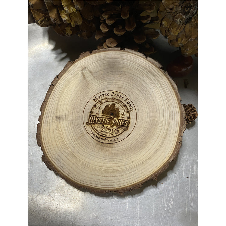 These custom memorials are approximately 5" (inches) round and laser engraved on natural wood.