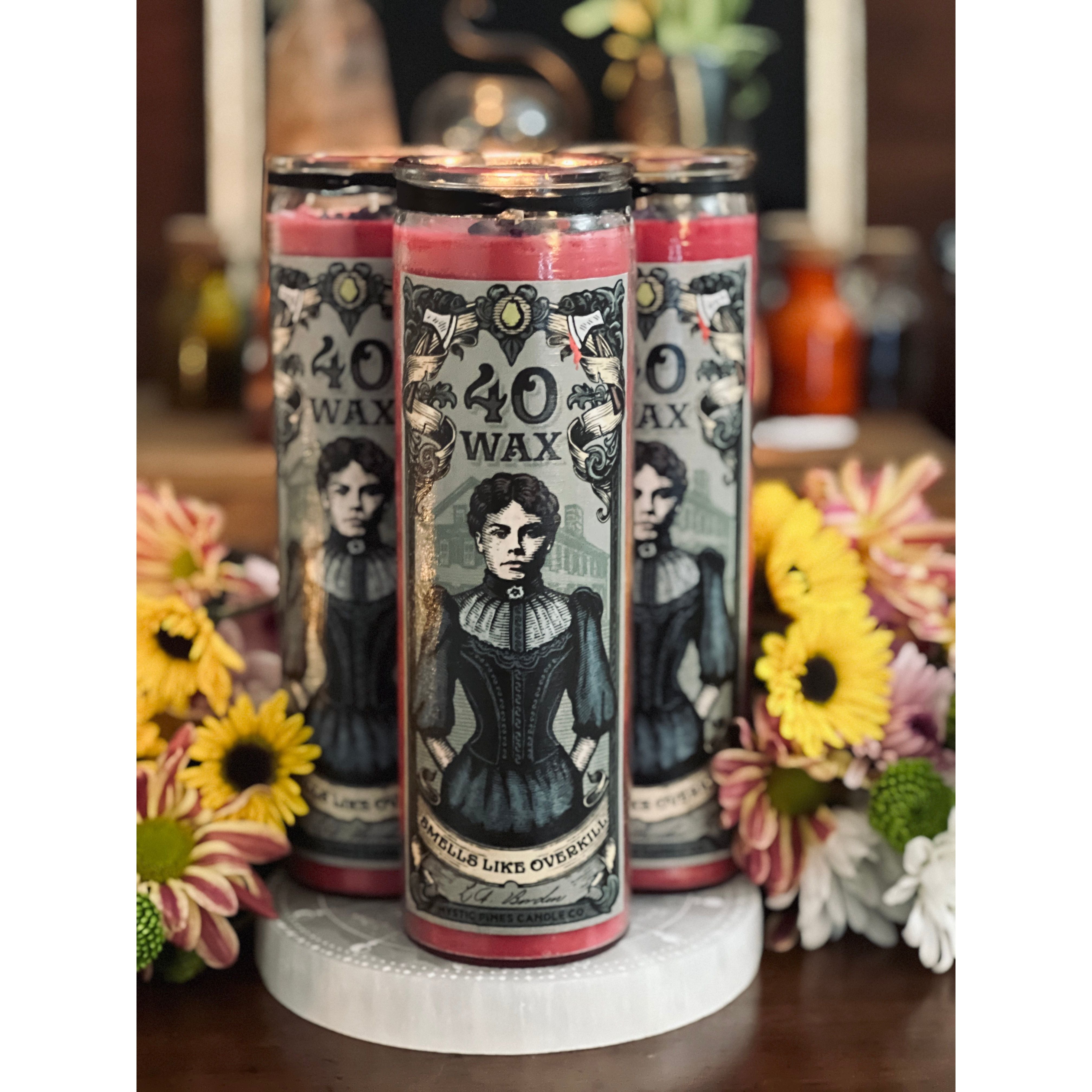 Our 40 Wax is a handcrafted, 100% American-grown soy wax, cotton-wicked (lead-free), crystal blessed candle infused with Dragon's Blood, Black Currant, Pear, Absinthe...and extremely dark history. This creation is crowned with Amethyst, Bloodstone, Garnet & Clear Quartz to enhance the mystery behind it all.