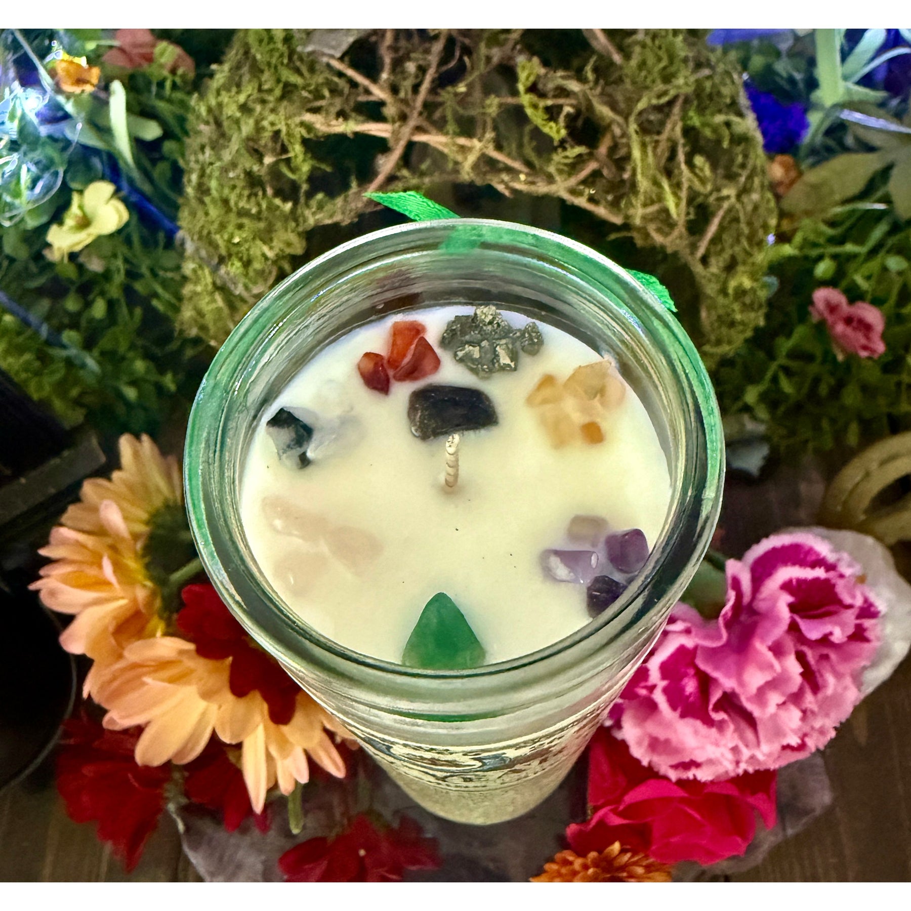 🕯️ About Mystic Pines Candles ~ Our candles are meticulously handcrafted using 100% American-grown soy and beeswax. Each candle features a lead-free cotton wick and receives crystal blessings.
