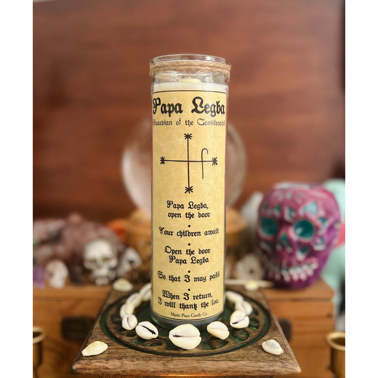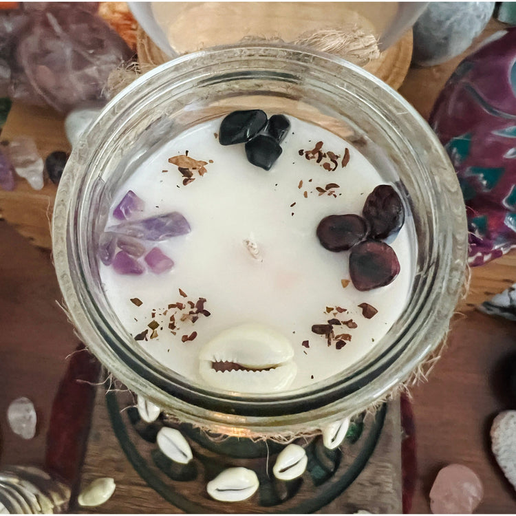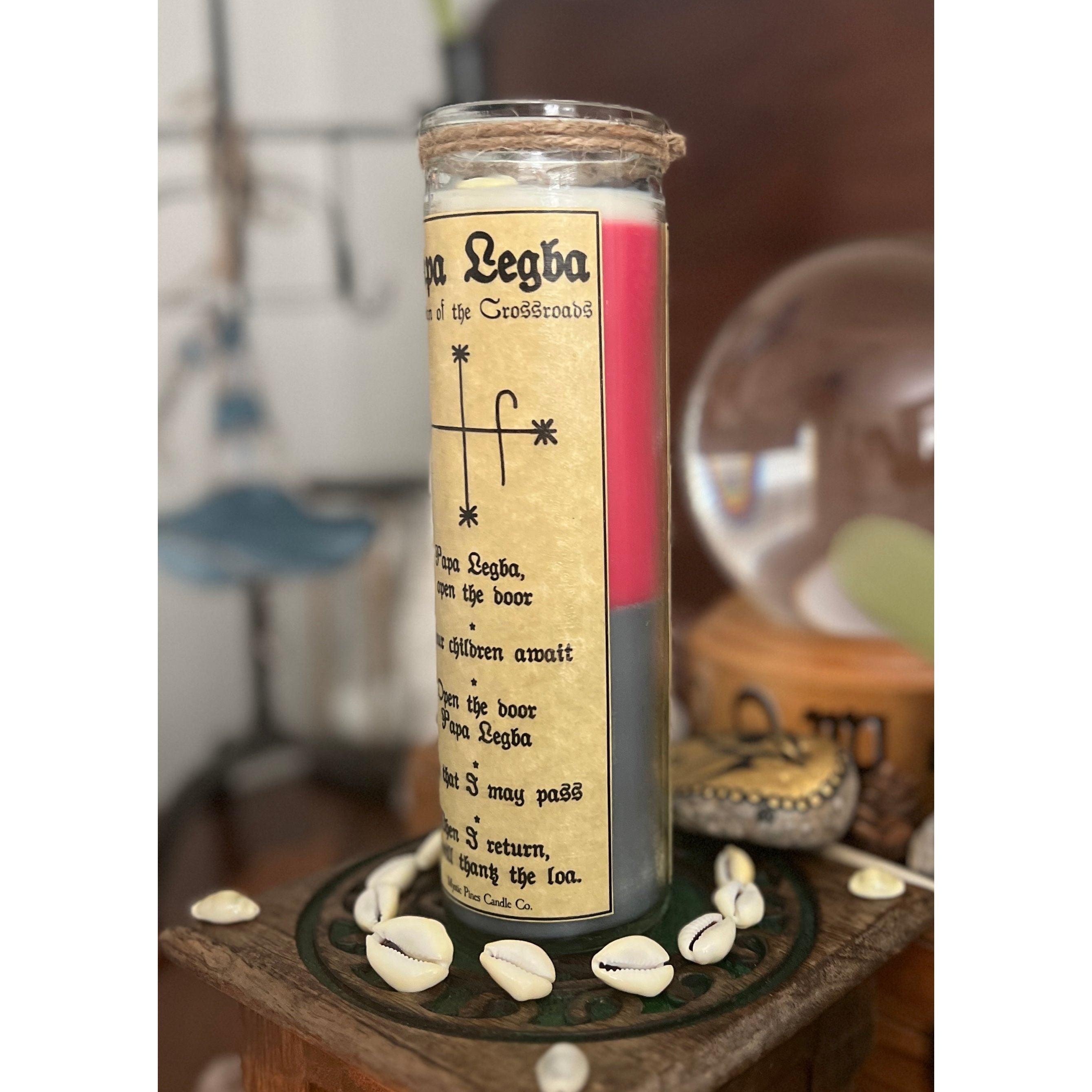 We wanted to celebrate Papa Legba by creating a red, black and white layered soy candle, scented with Rum, Tobacco, Vanilla, and Sugar, then crowned with Amethyst, Black Onyx, Garnet, dried tobacco, 3 pennies and a Cowrie Shell.