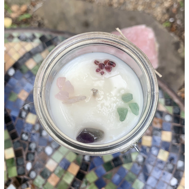 Introducing our Saint Valentine candle, a 16 oz 100% American-grown soy and beeswax, cotton-wicked, crystal-blessed creation. This candle is crowned with: